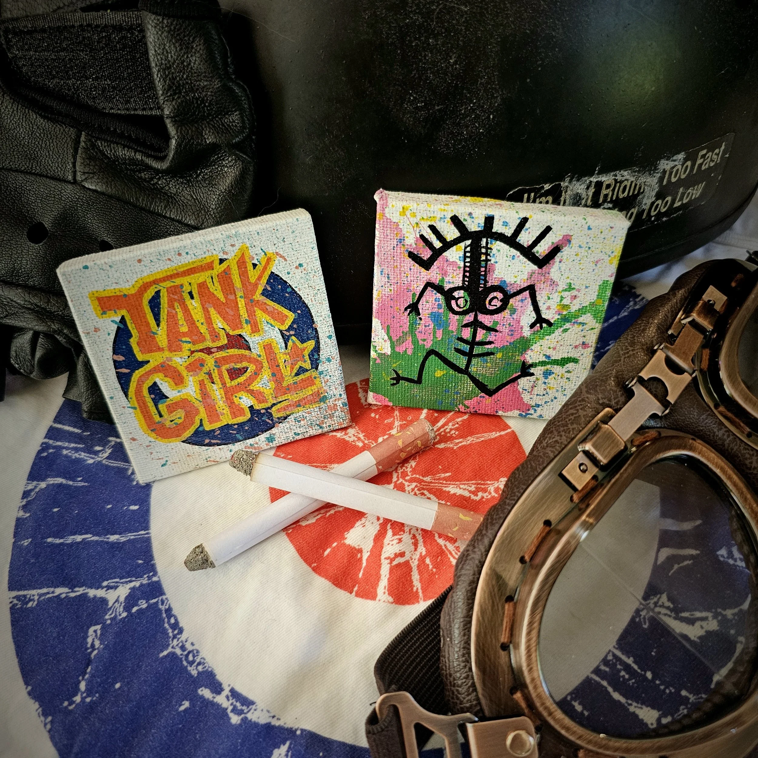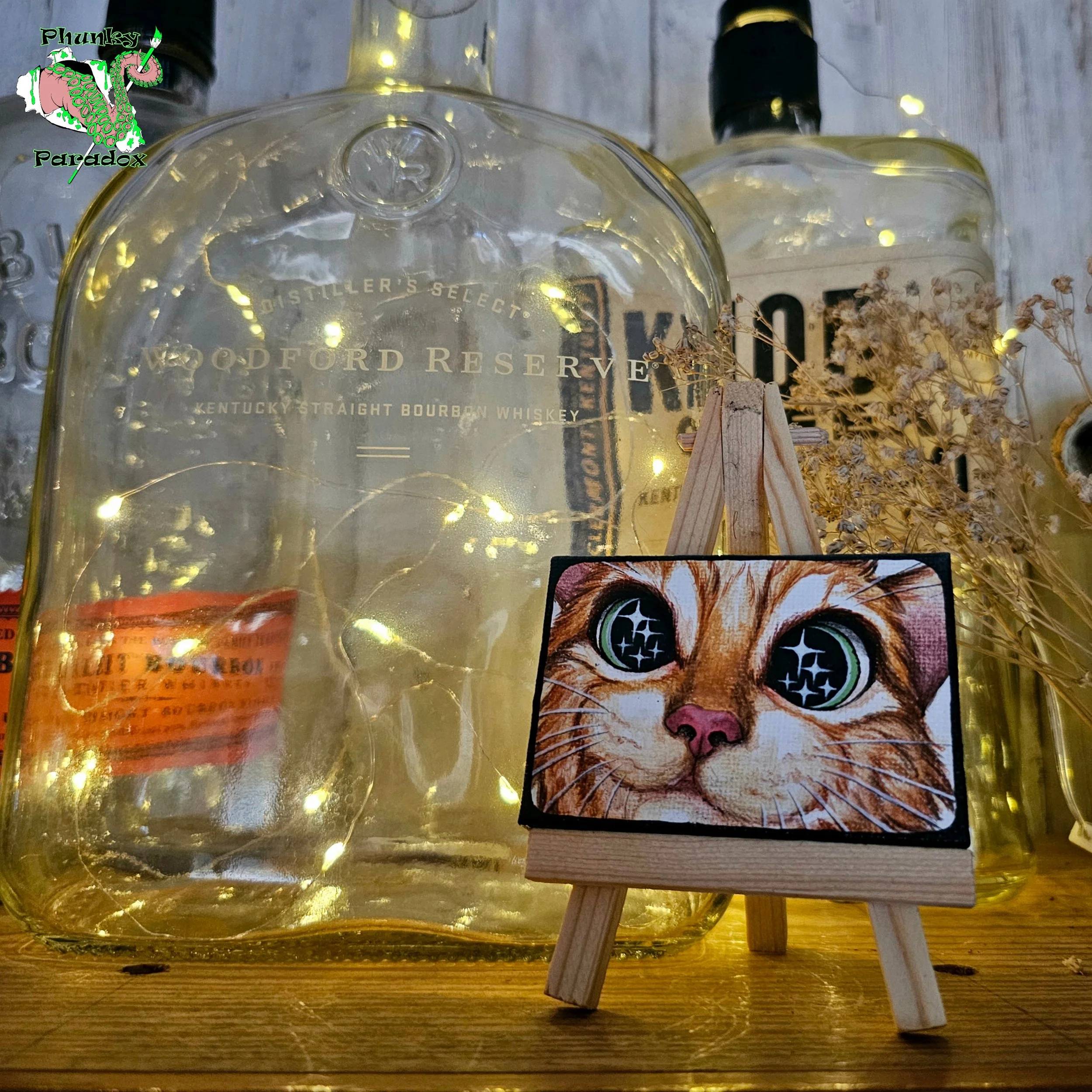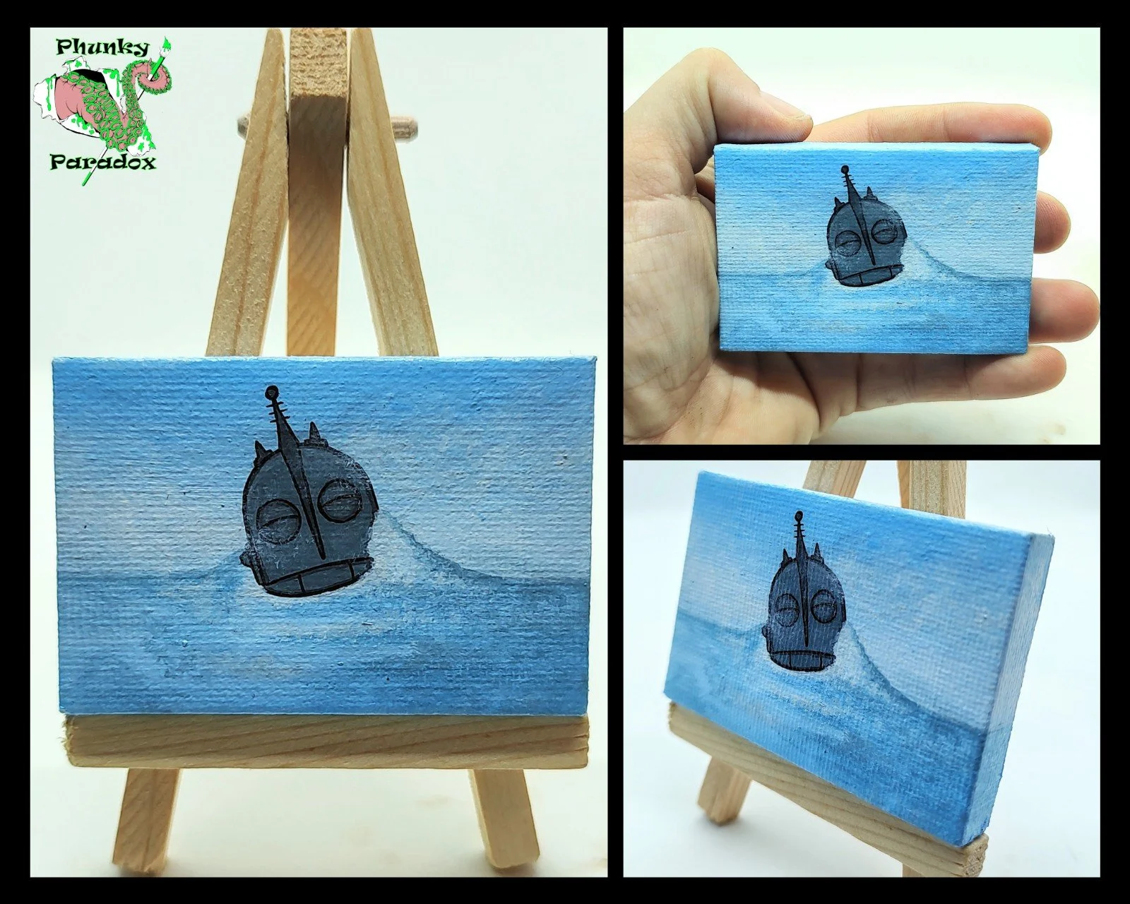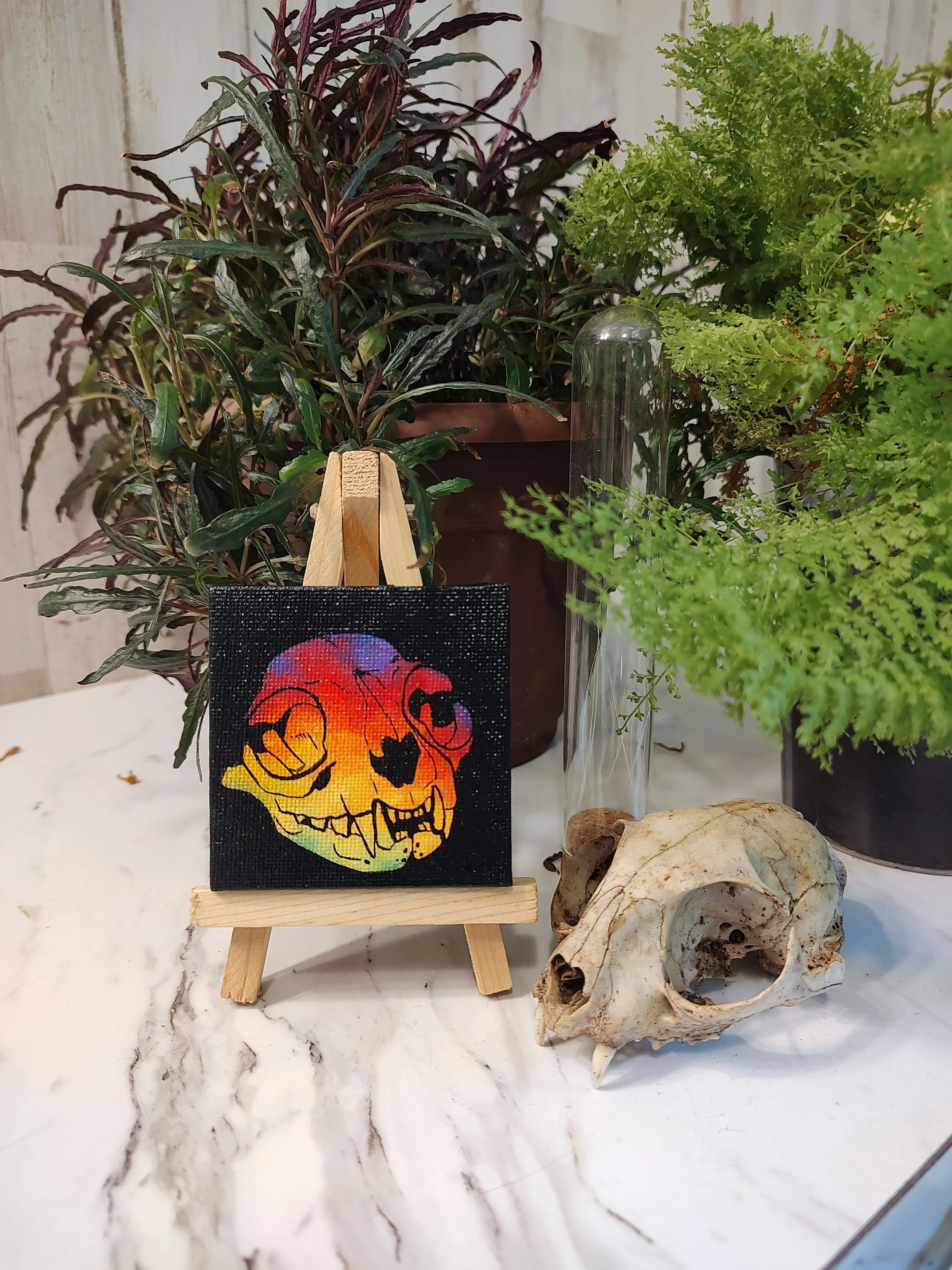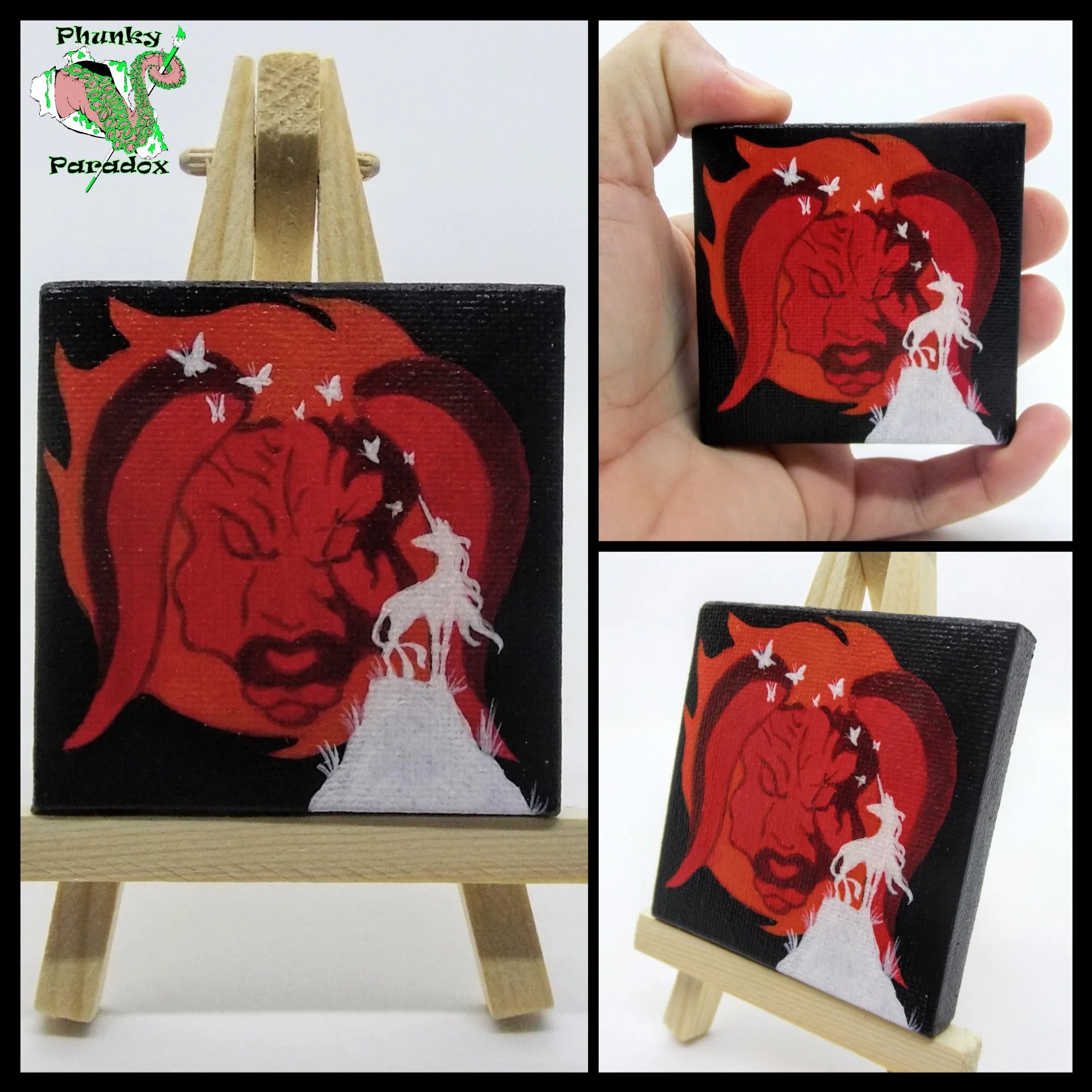 My main specialty in the traditional art realm are my miniature acrylic paintings. I work solely in acrylics, and all of these works are hand-painted on tiny 2.5x2.5 or 2x3 inch stretched canvasses, without the use of stencils or AI assistance.